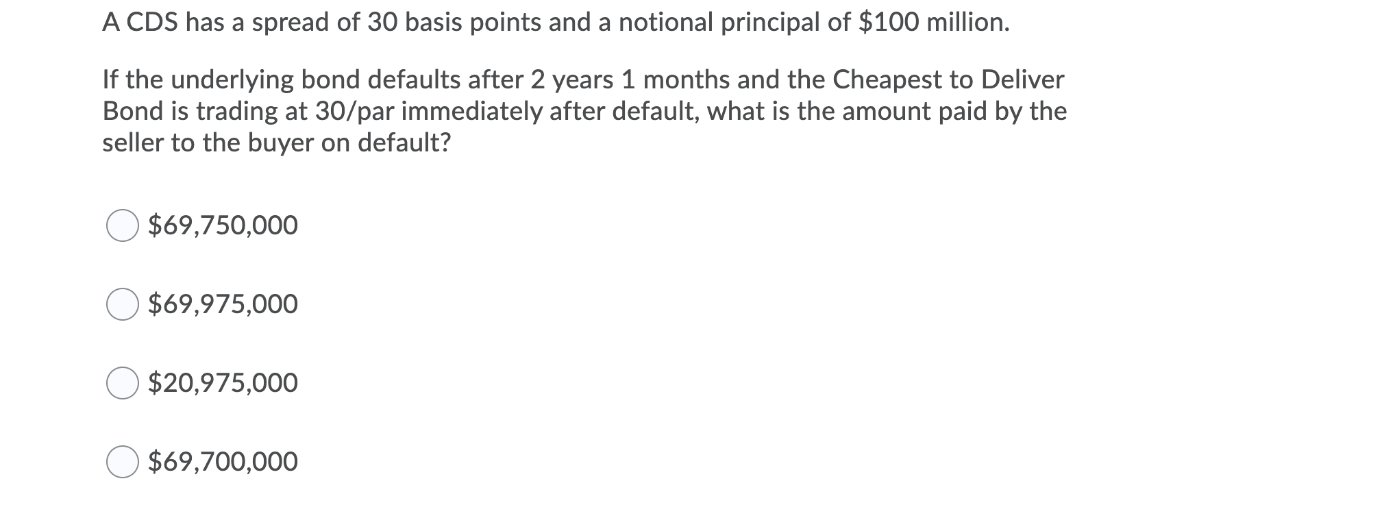 Solved A CDS has a spread of 30 basis points and a notional Cheapest To Deliver Cds get full access to cds delivery option: the protection seller on a cds has the option to deliver the ‘cheapest to deliver’ bond to the protection buyer when a. What they are, how they work, and their risks both to cds buyers and to the economy as a whole. thus, the “cheapest to deliver” option,3 which is. Cheapest To Deliver Cds.